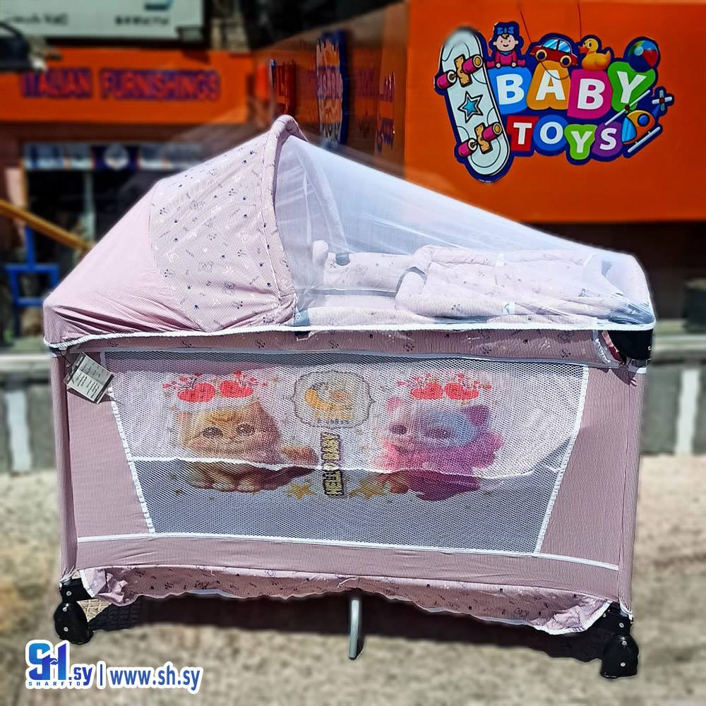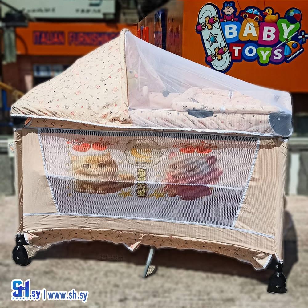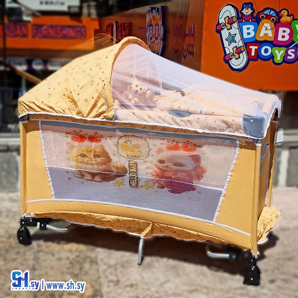 The two floors are an upper floor for the first months of the baby’s life and a basic lower floor for a child up to 6 years old + a swinging rocker that has an opening and closing feature + a folding and moving feature + a wheeled feature + an additional small movable mattress for cleaning + a side pocket to store the baby’s belongings + a side entry and exit hole equipped with With a zipper + a mosquito net and a cloth and screen canopy with a bow and to protect against insects + a foldable sponge wooden mattress + a small storage size 80*28*28 cm + excellent quality cotton fabrics + stable digital printing