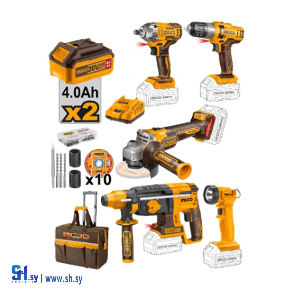 1- 22mm Compressor CRHLI20228 2- Battery Rocket Grinding Machine CAGLI201158 3- Tightening Nut CIWLI2038 4- Drill CDLI200528 5- Bell CWLI2023 With two 4 amp batteries, charger, 10 discs, two cups, feathers and chisels Cloth bag with wheels