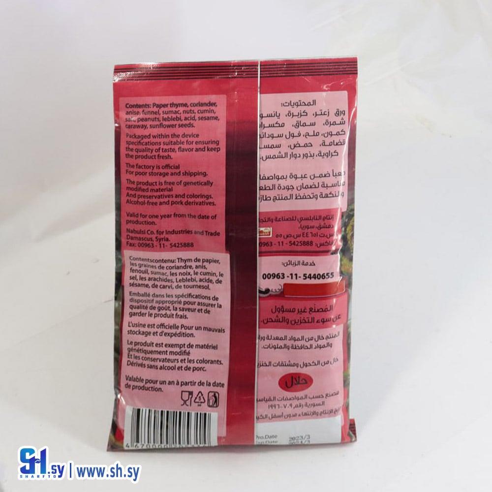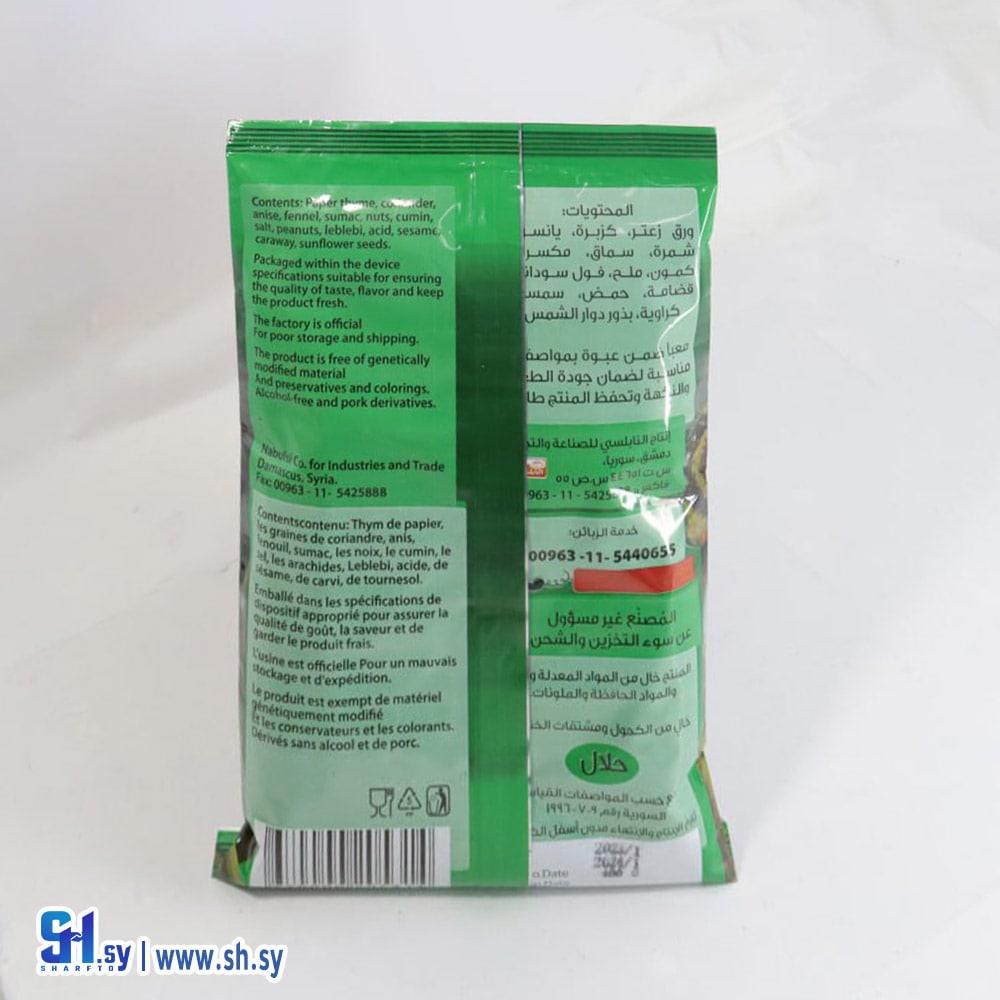 ورق زعتر , كزبرة , يانسون , شمرة , سماق , مكسرات , كمون , ملح , فول سوداني , قضامة , حمض , سمسم , كراوية , بذور دوار الشمس
