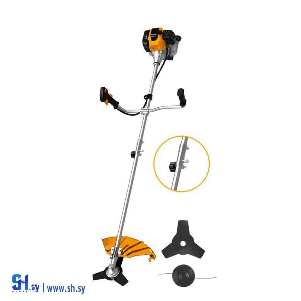"القياس: 42.7 cc المحرك: 1.25 كيلو واط (2 حصان) السرعة:8000 د/د قياس الخيط: 2.4 مم × 4 متر قياس الديسك: 255 مم 3 سنان سعة خزان البنزين:1200 مم محرك مرحلتين ضمن علبة كرتون "